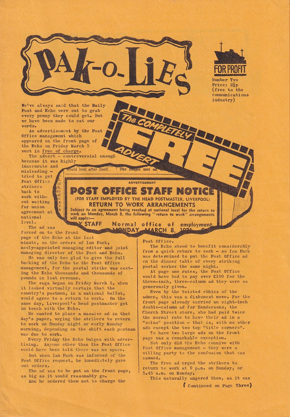 Pak-o-Lies was a critique of the Daily Post & Echo. It was distributed to staff entering and leaving their offices. The first issue was in January 1971 and the second issue a couple of months later.