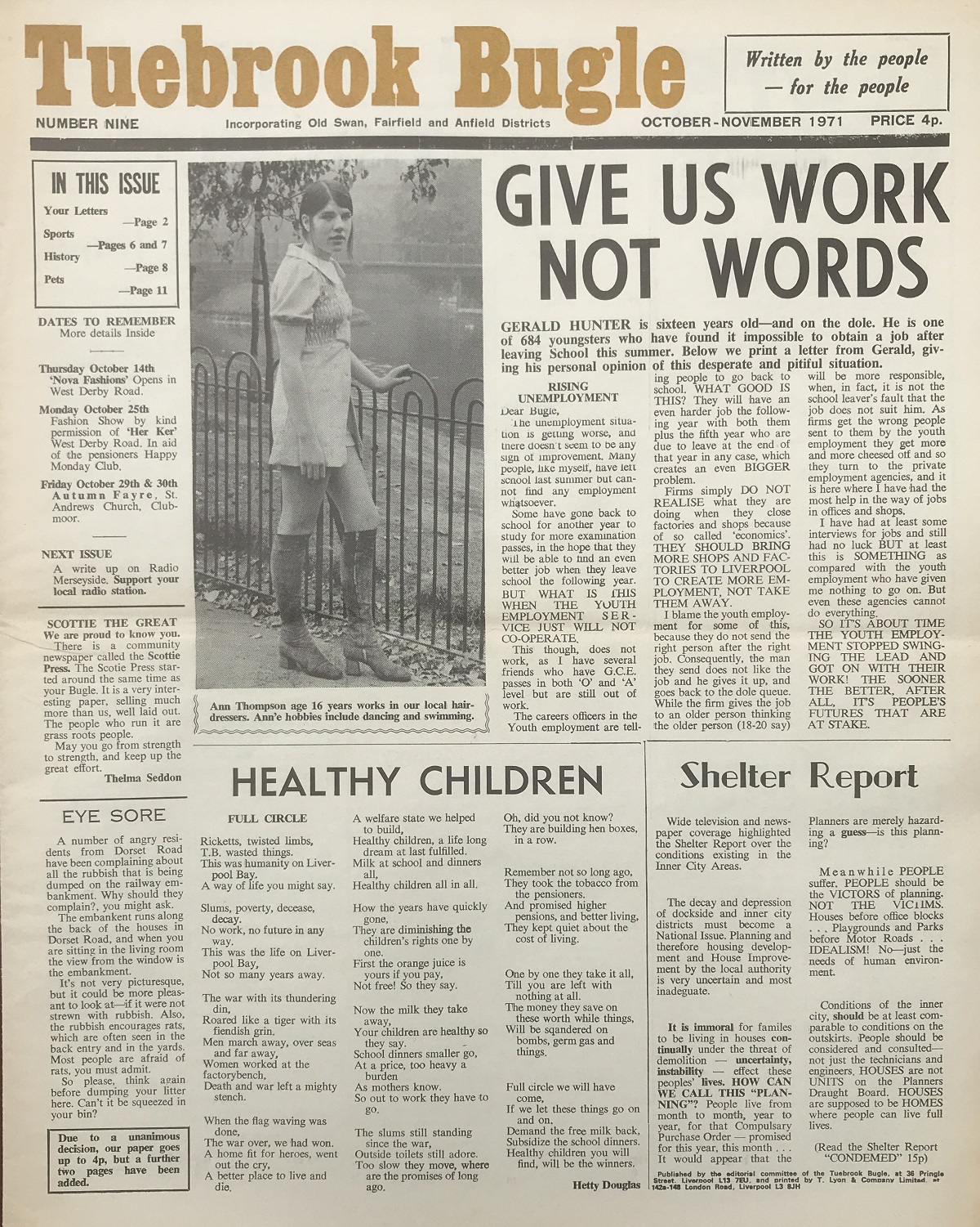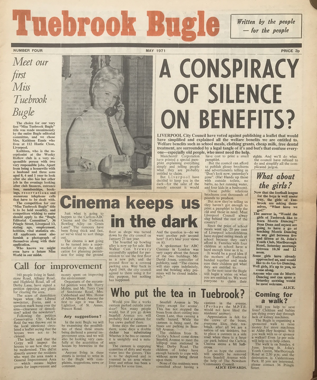 The Tuebrook Bugle was a community newspaper published in Liverpool during the 1970s under the slogan: “Written by the people for the people”. This online archive features six of its earliest issues.